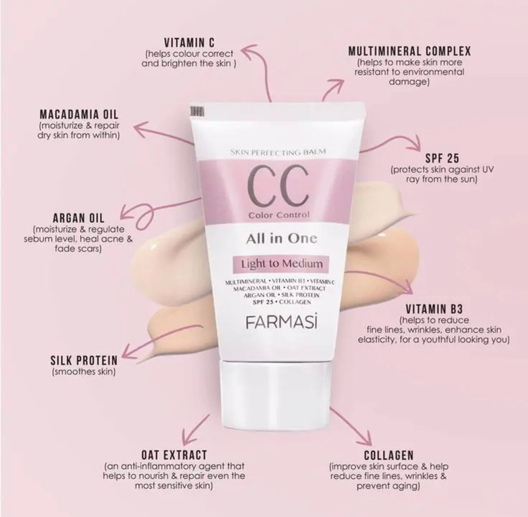 سی سی کرم فارماسی حاوی مولتی مینرال، روغن ماکادمیا، روغن آرگان، کلاژن، پروتئین ابریشم، عصاره جو دوسر، ویتامین B3، ویتامین C و SPF 25است. این ترکیبات ضمن کمک به محافظت و ترمیم پوست، ظاهری جوان، روشن تر و سالم تر به شما می بخشند