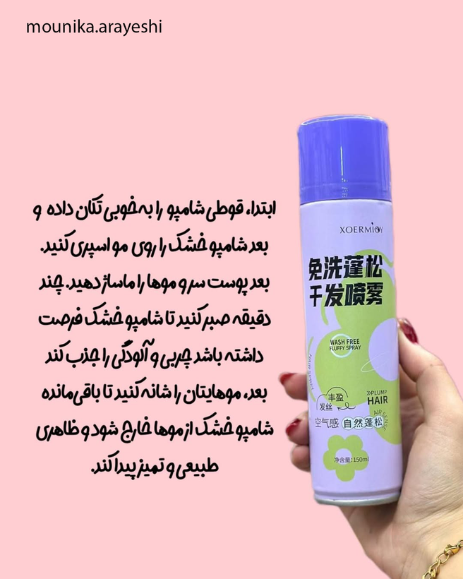 ابتدا، قوطی شامپو را بهخوبی تکان داده و بعد شامپو خشک را روی مو اسپری کنید. بعد پوست سر و موها را ماساژ دهید. چند دقیقه صبر کنید تا شامپو خشک فرصت داشته باشد چربی و آلودگی را جذب کند بعد، موهایتان را شانه کنید تا باقیمانده شامپو خشک از موها خارج شود و ظاهری طبیعی و تمیز پیدا کند.🧖🏻♀🧴